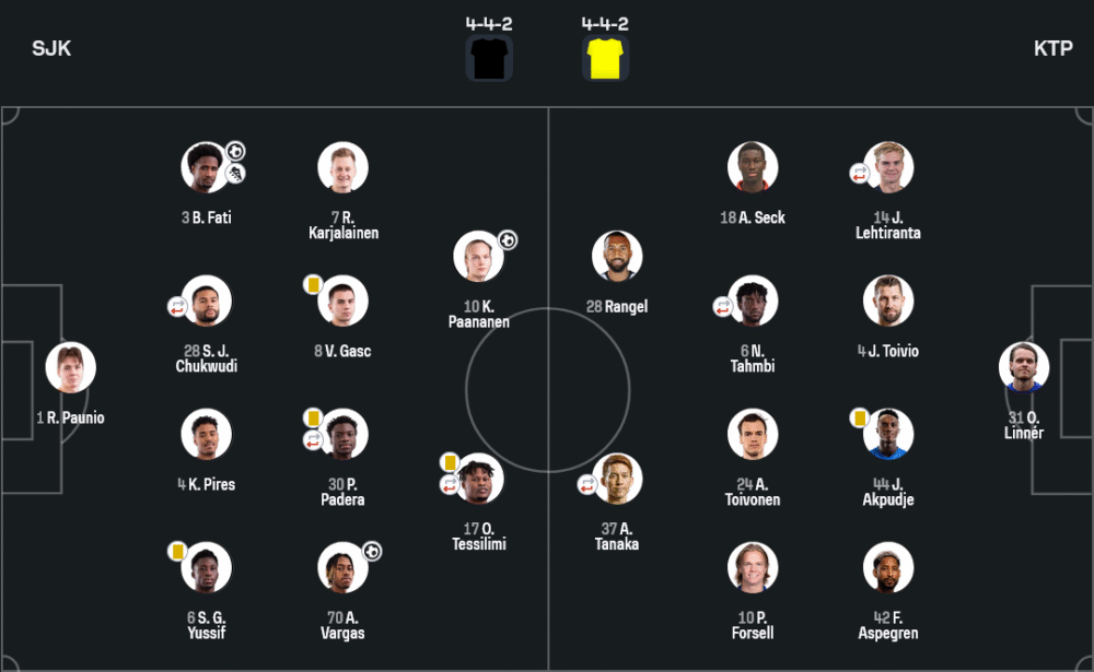 SJK ยืนพื้นด้วยระบบ 4-4-2 เน้นบอลริมเส้นและการเข้าทำที่มีความเร็ว โดยใช้ ฟาติ และ คาร์ยาลัยเนน เป็นหอกคู่ทะลวงแนวรับ KTP ซึ่งแผนนี้ตอบโจทย์สุด ๆ เพราะพวกเขาครองบอลเหนือกว่าและมีจังหวะเข้าทำถึง 13 ครั้ง เข้ากรอบ 7 ครั้ง ชัดเจนถึงความเฉียบขาดในพื้นที่สุดท้าย