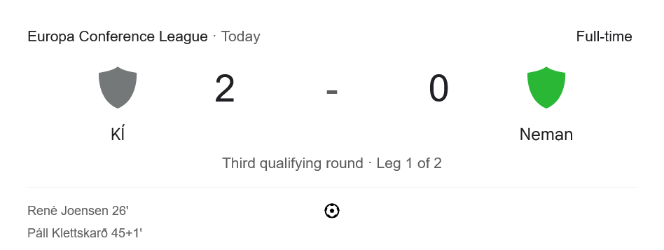 ศึกฟุตบอล ยูฟ่า ยูโรปา คอนเฟอเรนซ์ลีก 2025 รอบคัดเลือก รอบสาม นัดแรก ที่สนามของ เคไอ แคร๊กสวิก ทีมแกร่งจากหมู่เกาะแฟโร เปิดบ้านไล่บดเอาชนะ เนเมน กร็อดโน่ จากเบลารุสไปแบบเด็ดขาด 2-0 โดยเกมนี้ “บ้านกีฬา” ขอพาเจาะลึกฟอร์มการเล่นทั้งสองทีม พร้อมเก็บทุกจังหวะสำคัญให้แฟน ๆ ที่ติดตาม ผลบอลสด แบบไม่มีพลาด