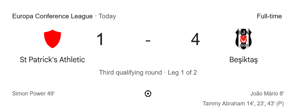 ศึกยูฟ่ายูโรปาคอนเฟอเรนซ์ลีก รอบคัดเลือกรอบสาม เลกแรก ที่สนามของเซนต์ แพตทริคส์ แอธเลติก จบลงแบบสุดมัน เมื่อ เบซิคตัส เจเค ทีมแกร่งจากตุรกีบุกมากระหน่ำ ชนะ 4-1 แบบไม่ไว้หน้า ส่งผลให้แฟนๆ บ้านผลบอล ที่ตามลุ้น ผลบอลสด ต่างสะเทือนใจไปตามๆ กันกับความเด็ดขาดของทีมจากอิสตันบูล
