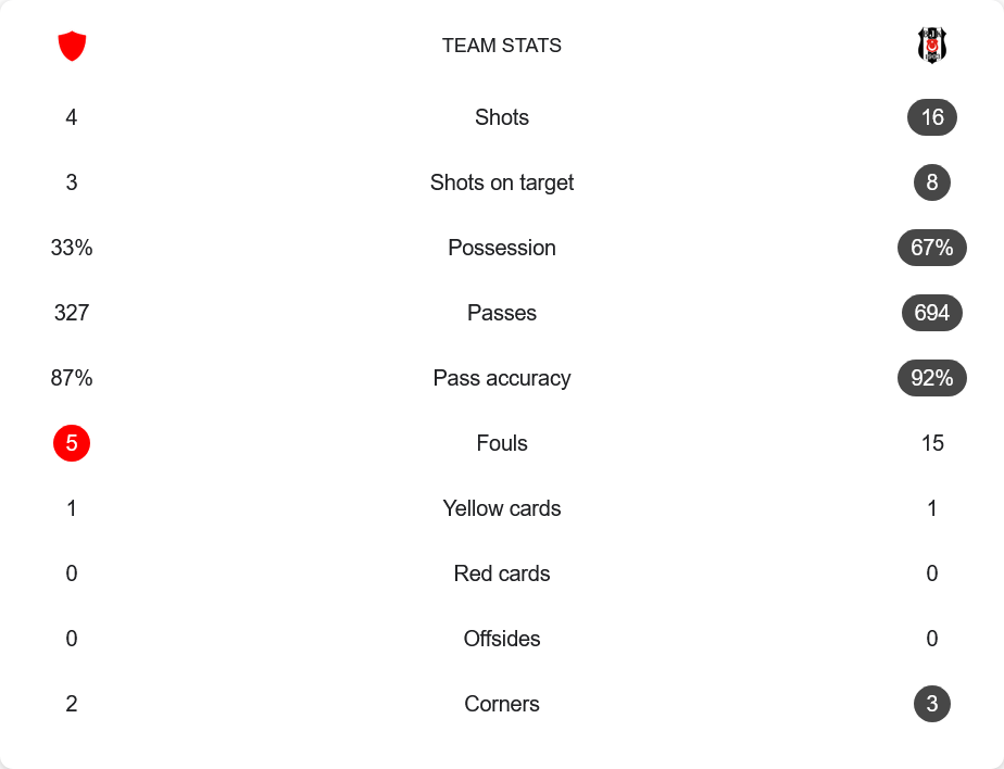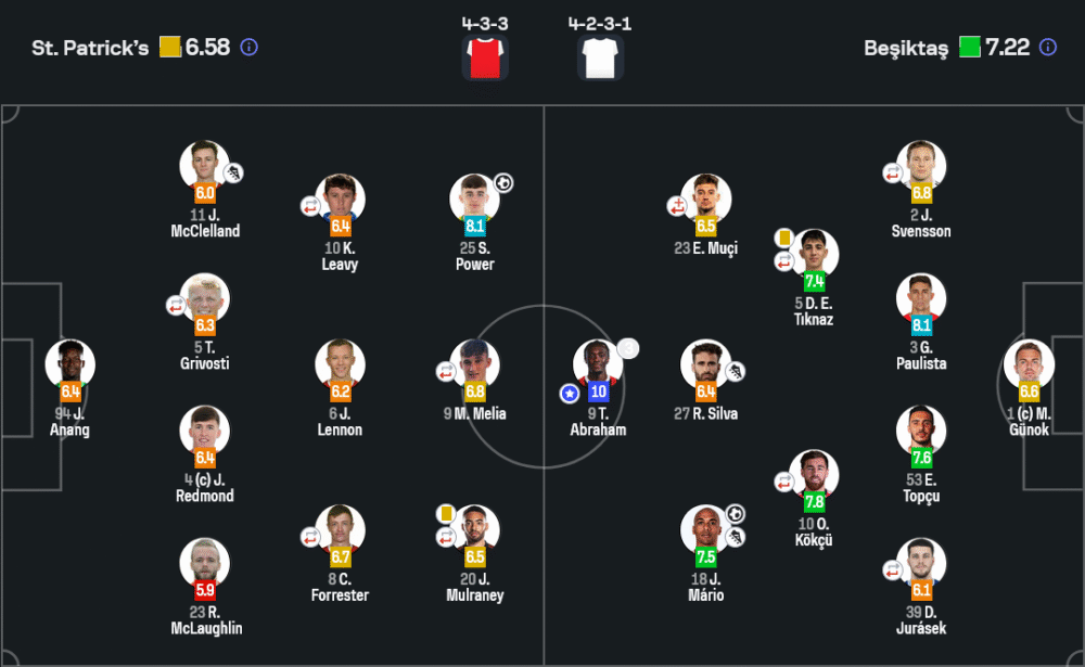 ตลอด 90 นาที เบซิคตัสแสดงให้เห็นถึงการครองบอลที่เหนือกว่าชัดเจน โดยครองบอลได้ถึง 67% เทียบกับเซนต์ แพตทริคส์ที่มีแค่ 33% เท่านั้น พวกเขาจ่ายบอลสำเร็จมากถึง 92% จากทั้งหมด 694 ครั้ง ขณะที่เจ้าบ้านทำได้ 87% จาก 327 ครั้ง ในด้านการยิงประตู ทีมเยือนลั่นไกไปถึง 16 ครั้ง เข้ากรอบ 8 ส่วนเจ้าบ้านมีโอกาสแค่ 4 ครั้ง ยิงตรงกรอบ 3 ถือว่าถูกกดแทบทั้งเกม เบซิคตัสยังได้ลูกเตะมุมมากกว่า (3 ต่อ 2) และมีจำนวนฟาวล์มากถึง 15 ครั้ง ซึ่งเป็นผลมาจากการพยายามหยุดจังหวะสวนกลับของเจ้าบ้าน