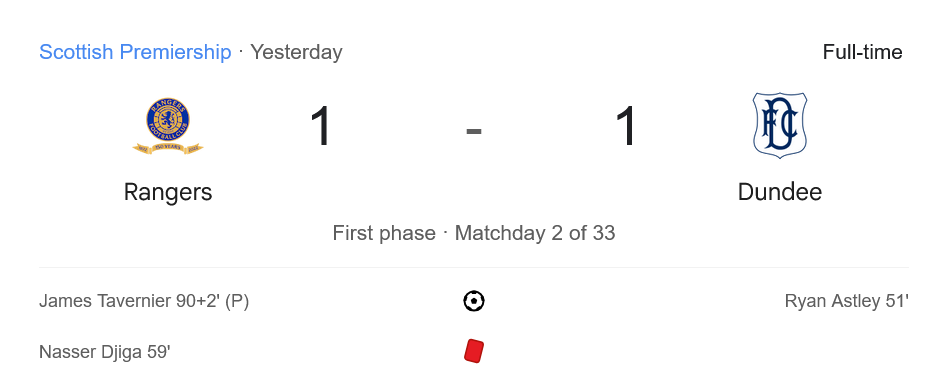 ดันดีสร้างช็อกให้แฟนเรนเจอร์ส นาที 51 จากลูกฟรีคิกที่ คามมี โรเบิร์ตสัน เปิดให้ ไรอัน แอสต์ลีย์ โขกเสียบตาข่ายเป็น 0-1 เกมเดือดขึ้นเมื่อ นาสเซอร์ จิกา ของเรนเจอร์สโดนใบแดงนาที 59 หลังตัดฟาวล์สุดท้ายในฐานะ “last man” ทำให้เรนเจอร์สต้องเหลือ 10 คน แต่ดันดีไม่สามารถคุมเกมได้ในช่วงท้าย เจ้าถิ่นบุกหนักและมาได้จุดโทษนาที 90+2 แทเวอร์เนียร์รับหน้าที่สังหารไม่พลาด ตีเสมอเป็น 1-1 ก่อนเกือบได้ประตูชัยจาก เซดดริก เดสเซอร์ส แต่ VAR ยกเลิกเพราะฟาวล์ไปก่อน จบเกมแบ่งแต้มกันไป