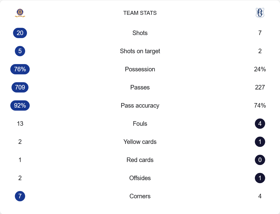 เรนเจอร์สครองบอลมากถึง 76% ต่อ 24% จ่ายบอล 709 ต่อ 227 ครั้ง ความแม่นยำ 92% ต่อ 74% สร้างโอกาสยิง 20 ต่อ 7 เข้ากรอบ 5 ต่อ 2 ได้เตะมุมมากกว่า 7 ต่อ 4 แต่โดนดันดีนำก่อนจากลูกโหม่ง เตะมุมและการจบสกอร์ยังไม่เฉียบพอ แม้จะได้เปรียบด้านตัวเลข แต่การโดนใบแดงทำให้ต้องใช้พลังไล่ตีเสมอในช่วงท้าย