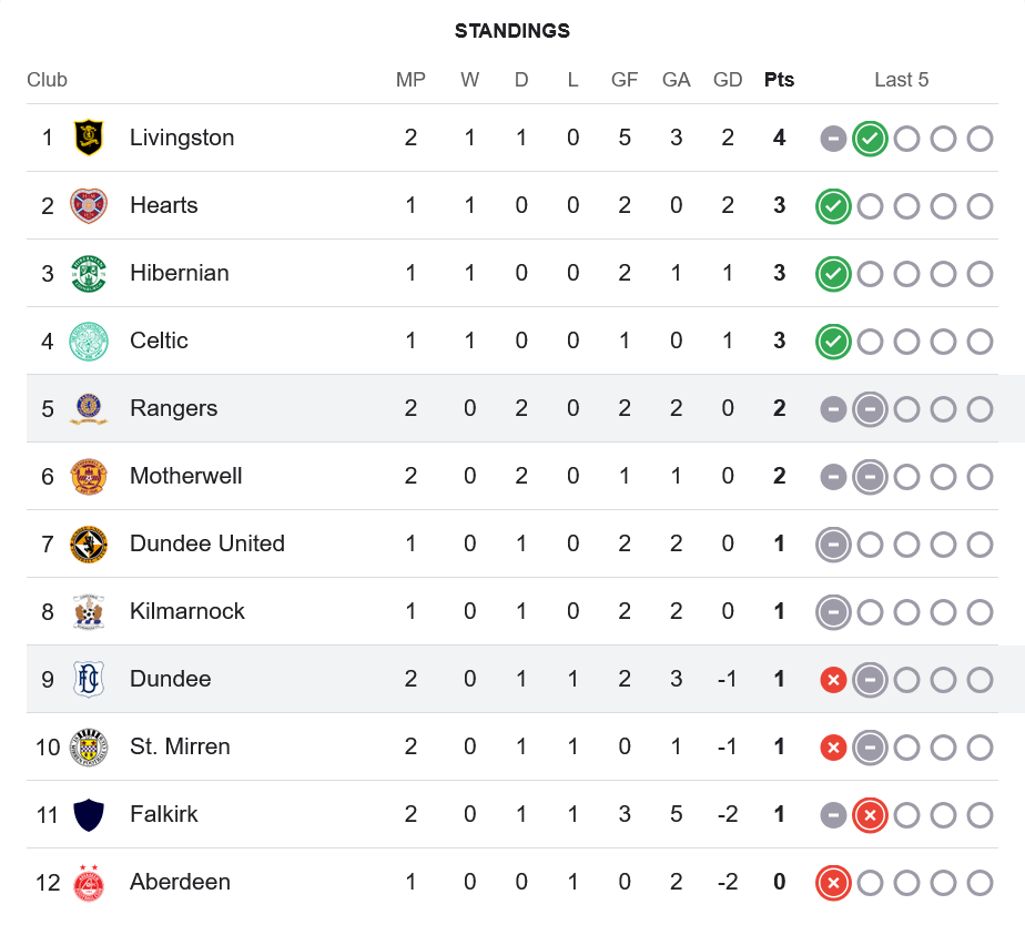 เรนเจอร์สเก็บได้เพียง 2 แต้มจาก 2 นัด อยู่อันดับ 5 ของตาราง ส่วนดันดีมี 1 แต้ม รั้งอันดับ 9 ซึ่งผลเสมอนัดนี้ทำให้ทั้งคู่ยังต้องไล่ล่าชัยชนะนัดแรกในลีก