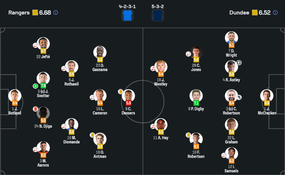 ดันดีใช้แผน 5-3-2 แบบ ultra-defensive เน้นตั้งโซนกลางลึกและบีบพื้นที่ในกรอบเขตโทษ เล่นบอลสวนกลับเร็วเมื่อมีโอกาส ประตูขึ้นนำมาจากการใช้ลูกตั้งเตะให้เกิดประโยชน์สูงสุด จุดอ่อนยังอยู่ที่การครองบอลเพียง 24% ทำให้โดนบุกซ้ำจนเสียจุดโทษท้ายเกม ภาพรวมเชิง วิเคราะห์บอล แสดงให้เห็นว่าดันดีใช้แผนรับเต็มพิกัด ส่วนเรนเจอร์สต้องหาทางเพิ่มความเฉียบคมในพื้นที่สุดท้าย