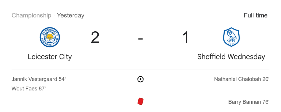 จิ้งจอกเปลี่ยนหมากทันที ส่ง แฮร์รี วิงค์ส ลงมาคุมจังหวะแทน โอลิเวอร์ สกิปป์ แล้วเกมไหลลื่นขึ้น นาที 54 เลสเตอร์ตีเสมอ 1-1 จากลูกครอสของ บิลาเอล เอล คันนุสส์ ไปเข้าหัว ยานนิค เวสเตอร์การ์ด โขกเสียบเสา นาที 76 จุดเปลี่ยนใหญ่ของเกมเมื่อ แบร์รี แบนแนน โดนใบแดงตรง ทำให้ผู้มาเยือนเหลือ 10 คน เจ้าถิ่นโหมหนักจนผลิดอก นาที 87 วูต ฟาเอส เติมขึ้นมาโขกจากการวางของ เอล คันนุสส์ อีกครั้งเป็น 2-1 ช่วงทดเวลาบาดเจ็บ เชฟฯ เว้นส์ฯ ถอดกองหลังยัดหอกหวังตีเสมอ แต่ไม่ทัน จบเกมเลสเตอร์ประเดิมสามแต้มสุดท้าย