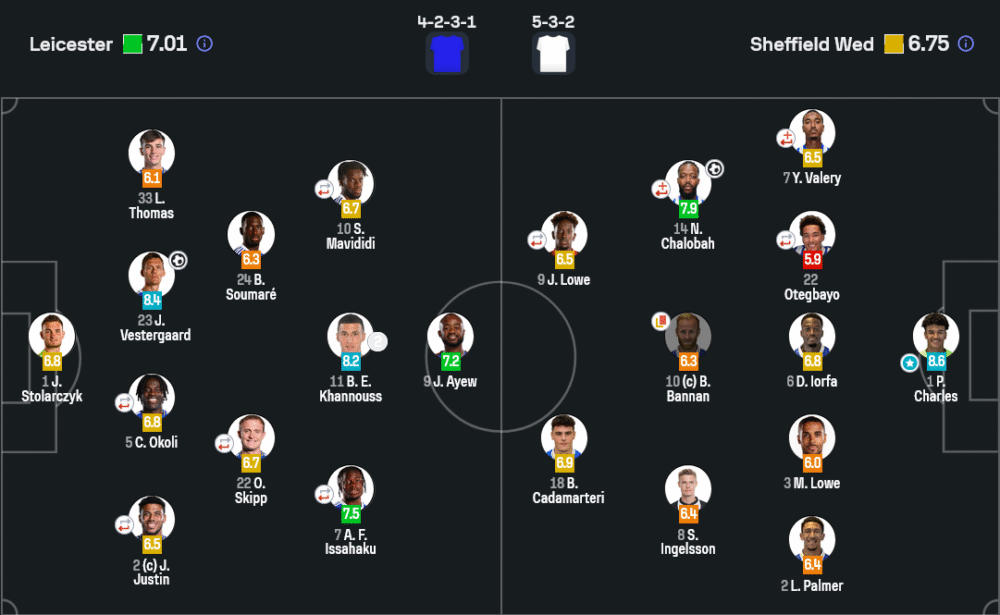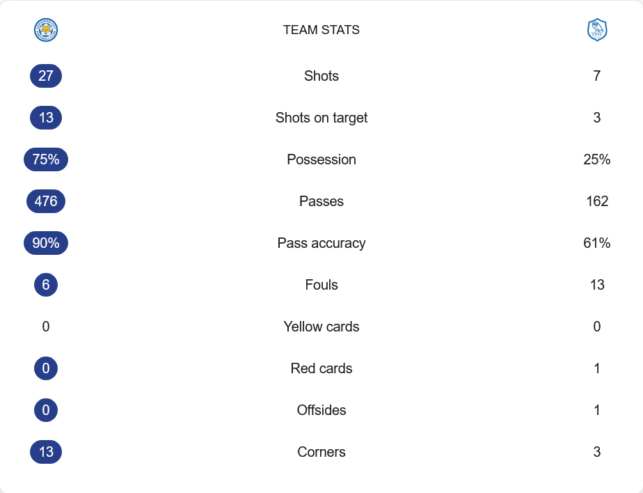 เลสเตอร์เดินหน้าบดทั้งเกม จบด้วยการยิงทั้งหมด 27 ครั้ง เข้ากรอบถึง 13 ครั้ง ขณะที่เชฟฯ เว้นส์ฯ ทำได้ 7 ครั้ง เข้ากรอบ 3 ครั้ง เจ้าถิ่นครองบอลมากถึง 75% ต่อ 25% และต่อบอลสำเร็จ 90% (476 ครั้ง) เหนือกว่าผู้มาเยือนที่จ่ายสำเร็จ 61% (162 ครั้ง) การทำฟาวล์เลสเตอร์มีเพียง 6 ครั้ง ส่วนทีมเยือนทำไป 13 ครั้ง ใบเหลืองไม่มีทั้งคู่ แต่จุดเปลี่ยนคือใบแดงตรงของแบนแนน นาที 76 ออฟไซด์เลสเตอร์ 0 vs เชฟฯ เว้นส์ฯ 1 และลูกเตะมุม เลสเตอร์ถล่ม 13 ต่อ 3 ตัวเลขทั้งหมดสะท้อนโมเมนตัมเกมที่ไหลไปอยู่กับเจ้าถิ่นชัดเจน