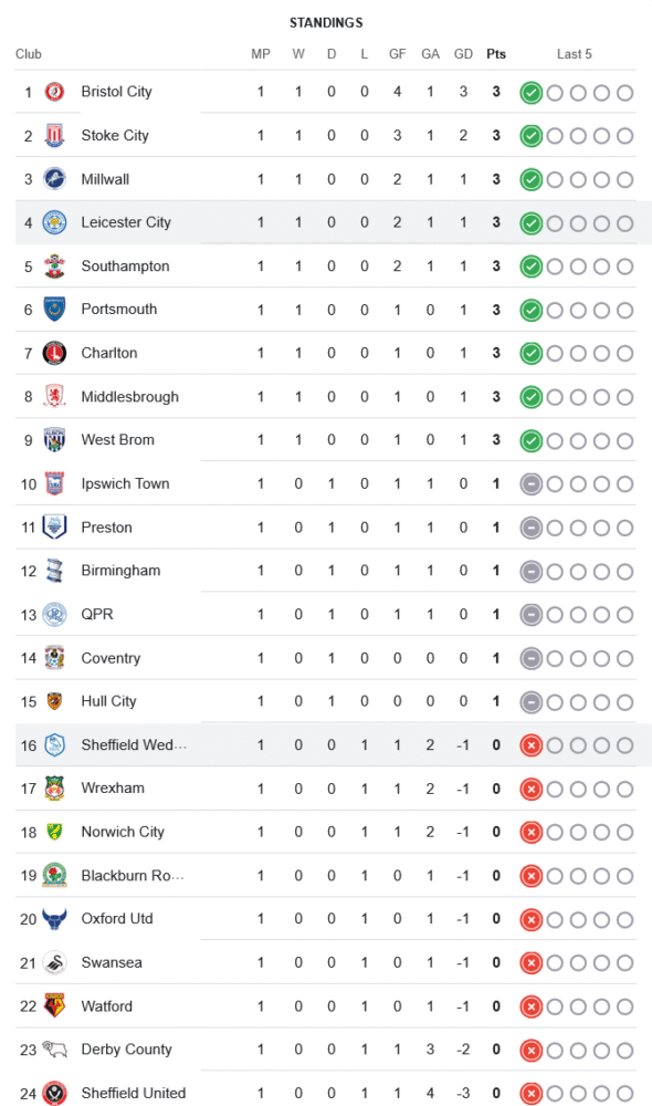 สามแต้มแรกพาเลสเตอร์ขึ้นกลุ่มหัวตารางทันที อยู่อันดับ 4 มี 3 คะแนน ประตูได้-เสีย +1 ตามหลังบริสตอล ซิตี้, สโต๊ค และมิลล์วอลล์ แบบแต้มเท่ากัน ส่วนเชฟฟิลด์ เว้นส์เดย์ ยังมือเปล่าอยู่อันดับ 16 มี 0 คะแนน ประตูได้-เสีย -1 เกมหน้าแรงกดดันจึงตกที่ฝั่งนกเค้าแมวเต็มๆ