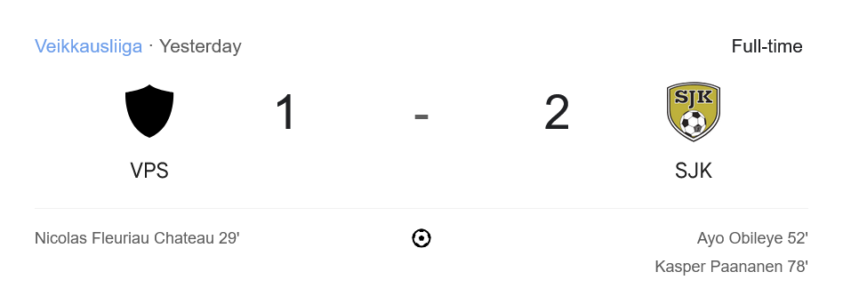 SJK แก้เกมทันควัน ลงมาเล่นอย่างดุดันและมีความแม่นยำมากขึ้น นาที 52 อโย โอบิเลเย เติมขึ้นมาโขกตีเสมอ 1-1 จุดประกายโมเมนตัมให้ทีมเยือน และในนาที 78 คาสเปอร์ พานาเนน ซัดประตูสุดเฉียบแซงนำ 2-1 ได้สำเร็จ จากนั้น VPS พยายามบุกกดดันช่วงท้ายแต่ไม่สามารถเจาะแนวรับของ SJK ได้ จบเกมทีมเยือนคว้าชัยด้วยสกอร์ 2-1