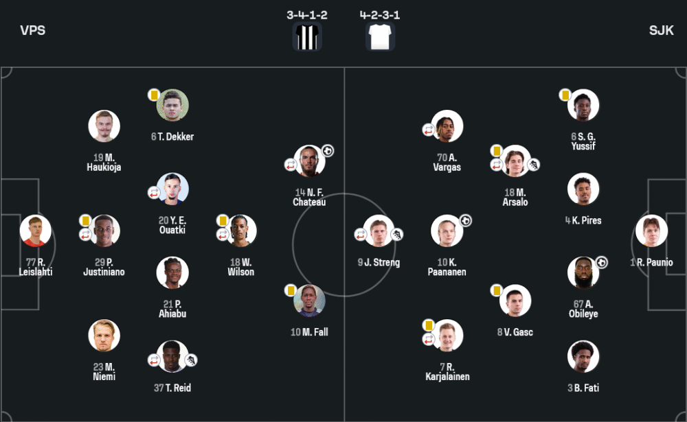 การเปลี่ยนตัว: วิลเมอร์ รอนน์เบิร์ก ⇄ จัสติเนียโน (67’), แอนต์ติ-วิลเล ไรซาเนน ⇄ วิลสัน (75’), อัลฟี โอเคล ⇄ ชาโตว์ (79’), ยาสซิน ดาวูซี ⇄ คิคาเล (84’), ออลี โอจาโคเนน ⇄ อูอัตกี (88’)