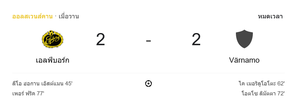 บ้านกีฬาเกาะติดเกมเดือดศึก ออลสเวนส์คาน ที่สนามบอร์ås อารีน่า เจ้าบ้าน เอล์ฟส์บอร์ก เปิดเกมรุกใส่ ไอเอฟเค วาร์นาโม่ เต็มสูบ แต่ดันพลาดเก็บสามแต้ม หลังทีมเยือนฮึดสู้จนไล่ตีเสมอ 2-2 ในเกมที่แฟนบอลเปิดดู ผลบอลสด แล้วบอกเป็นเสียงเดียวกันว่ามันส์ตั้งแต่นาทีแรกถึงวินาทีสุดท้าย
