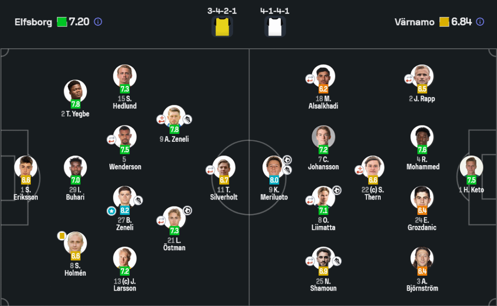 เบสฟอร์ท เซเนลี (เอล์ฟส์บอร์ก) เรตติ้ง 8.2 ทำสองแอสซิสต์สำคัญ สร้างโอกาสให้เพื่อนร่วมทีมได้หลายครั้ง และเป็นหัวใจในเกมรุกที่คอยเชื่อมระหว่างแดนกลางกับแดนหน้าอย่างลงตัว