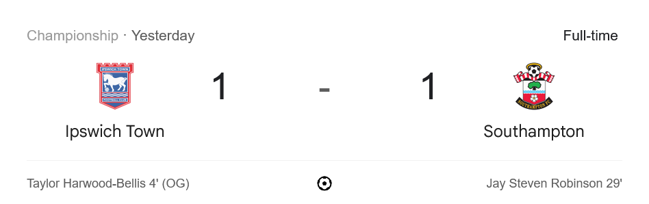 หลังผลเสมอในเกมนี้ เซาแธมป์ตันเก็บเพิ่มเป็น 4 แต้มจาก 2 นัด รั้งอันดับ 8 ของตารางอย่างสง่างาม ยังไม่แพ้ใคร และยังเกาะกลุ่มบนได้เหนียวแน่น ขณะที่ อิปสวิช ทาวน์ แม้จะยังไม่แพ้ แต่ก็สะดุดสองนัดติด เสมอรวด มีเพียง 2 แต้มจาก 2 เกม อยู่ในอันดับ 17 ซึ่งถือว่ายังต้องเร่งเครื่องหาชัยชนะให้ได้เร็วที่สุดหากไม่อยากหลุดวงโคจรลุ้นพื้นที่เพลย์ออฟ