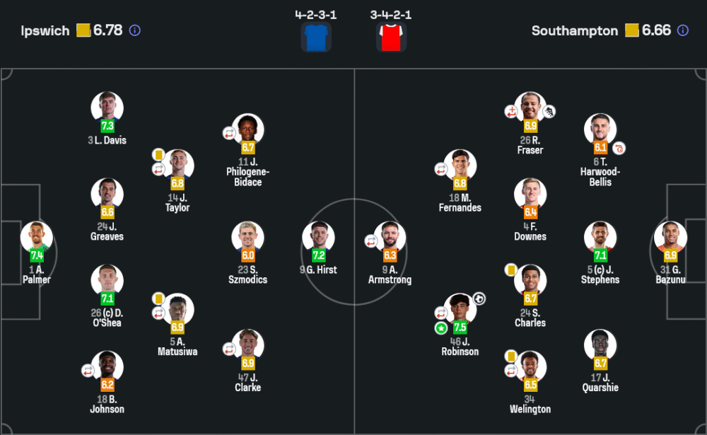 เกมนี้ทั้งสองทีมจัดแผนมาแตกต่างชัดเจน โดย อิปสวิช ทาวน์ ใช้ระบบ 4-2-3-1 ที่เน้นเกมริมเส้น มี L. Davis และ Philogene คอยเติมเกมบุก ส่วนกลางสนามใช้ Szmodics คอยปั้นเกม แต่จังหวะสุดท้ายยังขาดความคม