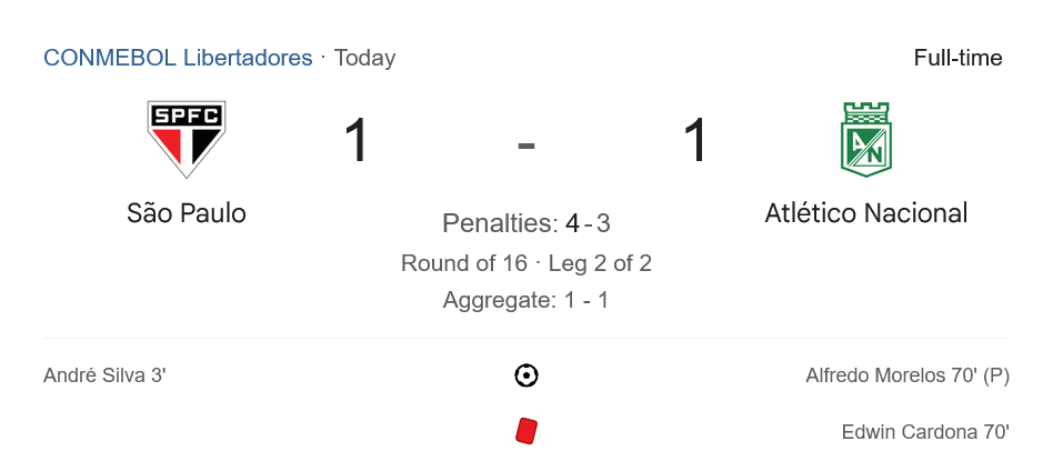 ศึกโกปาลิเบร์ตาโดเรส รอบ 16 ทีมสุดท้ายเมื่อคืนนี้ บ้านกีฬา เกาะติดรายงาน ผลบอลสด สุดดุเดือด เมื่อ เซาเปาโล เปิดบ้านเสมอ อัตเลติโก นาซิอองนาล 1-1 รวมผลสองนัด 1-1 ก่อนที่เจ้าถิ่นจะเฉือนชัยในการดวลจุดโทษ 4-3 ทะลุเข้ารอบต่อไปอย่างระทึกใจ