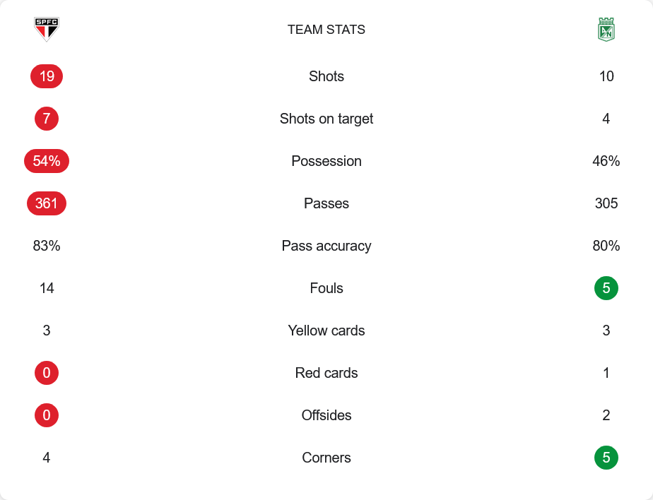 แม้ เซาเปาโล จะเหนือกว่าด้วยการครองบอล 54% และสร้างโอกาสยิงถึง 19 ครั้ง แต่พวกเขาก็เปลี่ยนเป็นประตูได้เพียงลูกเดียว ด้าน นาซิอองนาล แม้มีโอกาสยิงน้อยกว่า 10 ครั้ง แต่จบสกอร์ได้อย่างเฉียบขาด รวมถึงการได้จุดโทษสำคัญ ขณะที่ฟาวล์ของเจ้าบ้านสูงถึง 14 ครั้ง มากกว่าทีมเยือนเกือบสามเท่า แสดงให้เห็นถึงเกมที่ดุดันและเข้มข้นตลอดทั้งแมตช์