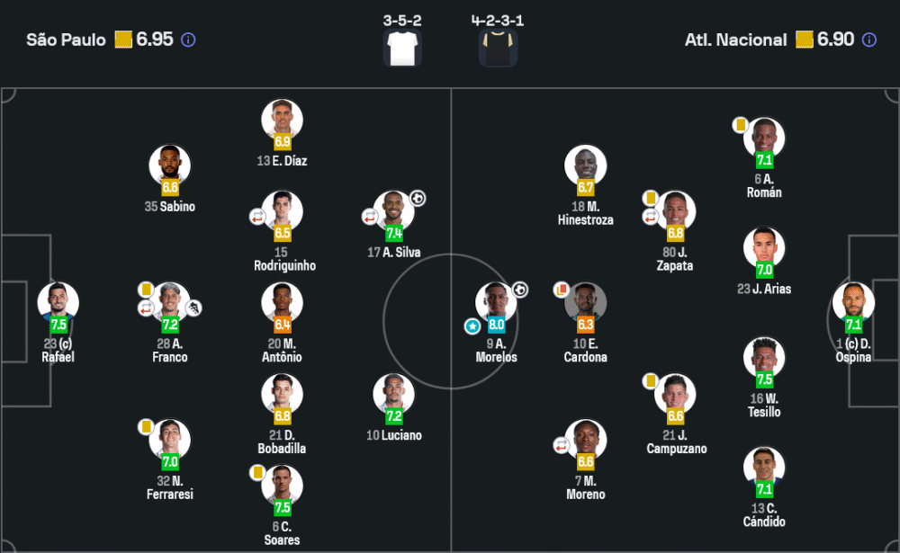 เกมนี้ เซาเปาโล ใช้ระบบ 3-5-2 ที่เน้นการครองบอลแดนกลาง เปิดเกมบุกเร็วทางริมเส้น ขณะที่แนวรับมีจังหวะเสียฟาวล์หลายครั้งเพราะต้องหยุดเกมสวนกลับของทีมเยือน อัตเลติโก นาซิอองนาล มาในแผน 4-2-3-1 เน้นตั้งรับเหนียวแน่นแล้วรอโต้กลับ โดยมี โมเรโลส เป็นตัวทีเด็ดในแดนหน้า การวิเคราะห์บอลเกมนี้เห็นชัดว่า เซาเปาโล ครองบอลได้มากกว่า แต่ความคมของนาซิอองนาลอันตรายทุกครั้งที่ได้จังหวะสวนกลับ