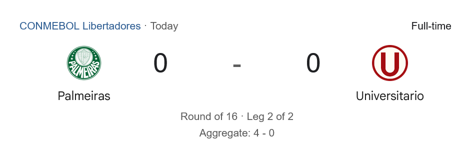 ผลเสมอ 0-0 เกมนี้ไม่ได้ทำให้พัลไมรัสเสียหาย เพราะพวกเขาตุนสกอร์จากเลกแรกมาแล้วถึง 4-0 รวมผลสองนัดเข้ารอบก่อนรองชนะเลิศได้อย่างมั่นใจ ส่วนยูนิเวอร์ซิตาริโอต้องหยุดเส้นทางไว้เพียงรอบ 16 ทีมสุดท้าย