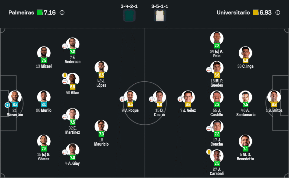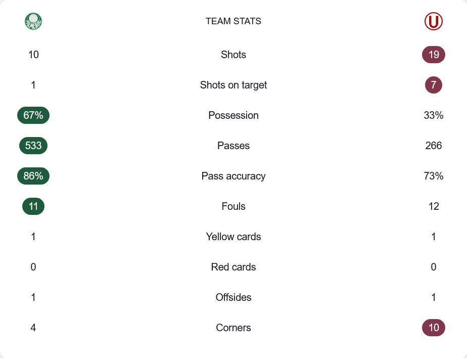 ตัวเลขบ่งบอกชัดเจน พัลไมรัสครองบอล 67% ทำการจ่ายบอลมากถึง 533 ครั้งและแม่นยำ 86% แต่มีโอกาสยิงเพียง 10 ครั้งเข้ากรอบแค่ 1 ครั้ง ขณะที่ยูนิเวอร์ซิตาริโอแม้ครองบอลน้อยเพียง 33% แต่ยิงได้มากกว่า 19 ครั้ง เข้ากรอบ 7 ครั้ง ถือว่ากดดันเจ้าบ้านได้ไม่น้อย เกมเต็มไปด้วยการเข้าปะทะ มีใบเหลืองฝั่งละหนึ่ง