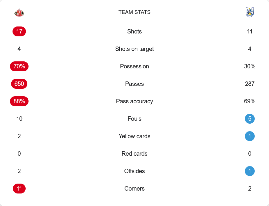 ซันเดอร์แลนด์เหนือกว่าชัดเจน ครองบอลถึง 70% สร้างโอกาสยิง 17 ครั้ง เข้ากรอบ 4 ครั้ง ส่วนฮัดเดอร์ฟิลด์มีโอกาสเพียง 11 ครั้ง เข้ากรอบ 4 ครั้งเท่ากัน ซันเดอร์แลนด์ผ่านบอลได้มากถึง 650 ครั้ง ความแม่นยำ 88% ขณะที่ทีมเยือนผ่านบอลเพียง 287 ครั้ง ความแม่นยำ 69% อย่างไรก็ตาม การยืนเกมรับที่แข็งแกร่งของฮัดเดอร์ฟิลด์คือปัจจัยสำคัญที่พาทีมยื้อจนถึงการดวลโทษและคว้าชัยไป