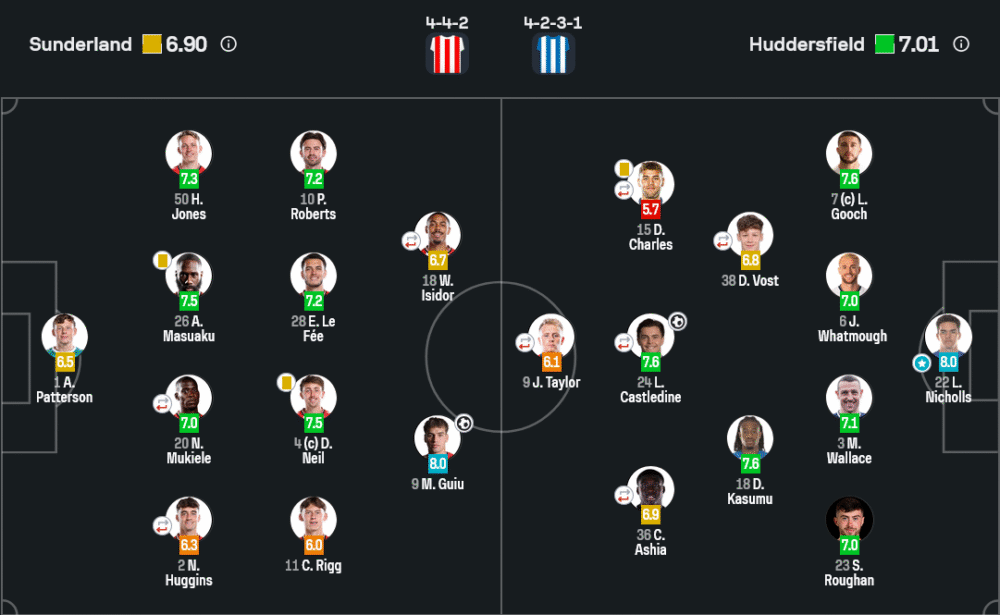 ซันเดอร์แลนด์เน้นเกมรุกแบบครองบอลเหนียวแน่น เล่นบุกทางริมเส้นโดยโรเบิร์ตส์และริกก์ ขณะที่กุยอูเป็นตัวพักบอลก่อนหาจังหวะเข้าทำ จุดแข็งคือการเซ็ตบอลต่อเนื่อง แต่ปัญหาคือความคมและการจบสกอร์ที่ยังไม่เด็ดขาด ด้านเกมรับแม้คุมบอลได้มากแต่เปิดพื้นที่ให้โดนโต้กลับง่าย ฮัดเดอร์ฟิลด์ใช้แท็กติกตั้งรับลึก รอจังหวะสวนกลับเป็นหลัก และมีนิโคลส์ผู้รักษาประตูที่เหนียวแน่นเป็นหัวใจสำคัญ ซึ่งหากมองในแง่ วิเคราะห์บอล ฮัดเดอร์ฟิลด์มีเกมรับที่รัดกุมและโต้กลับตรงจุดกว่าชัดเจน