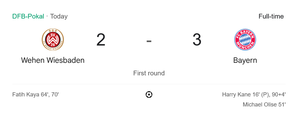ช่วงท้ายเกมบาเยิร์นบุกหนักหวังเอาชนะในเวลา และแล้วก็มาได้ประตูชัยนาที 90+4 จากจังหวะที่ เคน รับบอลแล้วจ่ายต่อให้ โยซิป สตานิซิช ซัดตุงตาข่าย จบเกม บาเยิร์น มิวนิค เฉือนชนะ เวเฮน เวียสบาเดน 3-2 แบบสุดดราม่า