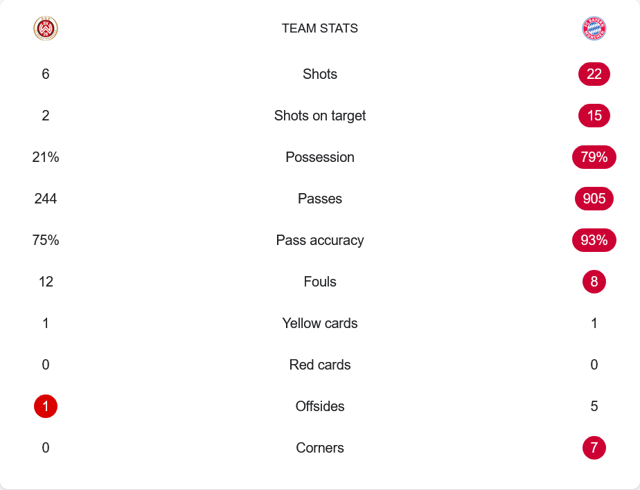 ตัวเลขยืนยันความเหนือกว่าของบาเยิร์นอย่างชัดเจน ยิงทั้งหมด 22 ครั้ง เข้ากรอบ 15 ครั้ง เทียบกับเวเฮนที่ยิงเพียง 6 ครั้ง เข้ากรอบ 2 ครั้ง การครองบอลบาเยิร์นมากถึง 79% และจ่ายบอล 905 ครั้ง สำเร็จ 93% ขณะที่เจ้าบ้านมีโอกาสสวนกลับไม่กี่ครั้งแต่ก็เปลี่ยนเป็นสองประตูได้ นี่คือสิ่งที่ทำให้เกมสนุกและตึงเครียดตลอด 90 นาที
