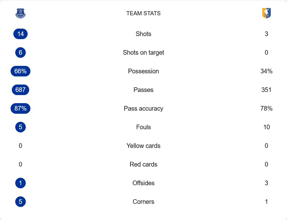 เกมนี้ เอฟเวอร์ตันครองบอลถึง 66% เหนือกว่าชัดเจน เทียบกับแมนส์ฟิลด์ที่มีเพียง 34% เจ้าบ้านมีโอกาสยิง 14 ครั้ง เข้ากรอบ 6 ครั้ง ขณะที่ทีมเยือนมีเพียง 3 ครั้งและไม่ตรงกรอบเลย อัตราการจ่ายบอลแม่นยำของเอฟเวอร์ตันอยู่ที่ 87% ส่วนแมนส์ฟิลด์ทำได้ 78% นี่คือสิ่งที่บอกชัดว่าเกมนี้เป็นการเล่นวันเวย์ของทอฟฟี่สีน้ำเงิน