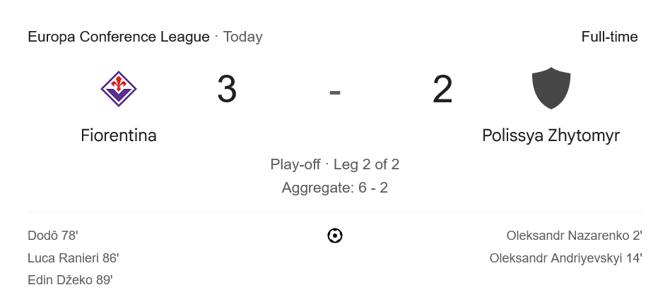 ฟิออเรนติน่าผ่านเข้ารอบแบ่งกลุ่มยูโรปาคอนเฟอเรนซ์ลีกด้วยสกอร์รวม 6-2 ย้ำสถานะทีมเต็งจากอิตาลี ส่วนโปลิสเซียตกรอบไปอย่างน่าเสียดาย แม้จะทำได้ดีในเลกสองแต่ก็ยังห่างชั้นกับทีมใหญ่ระดับยุโรป