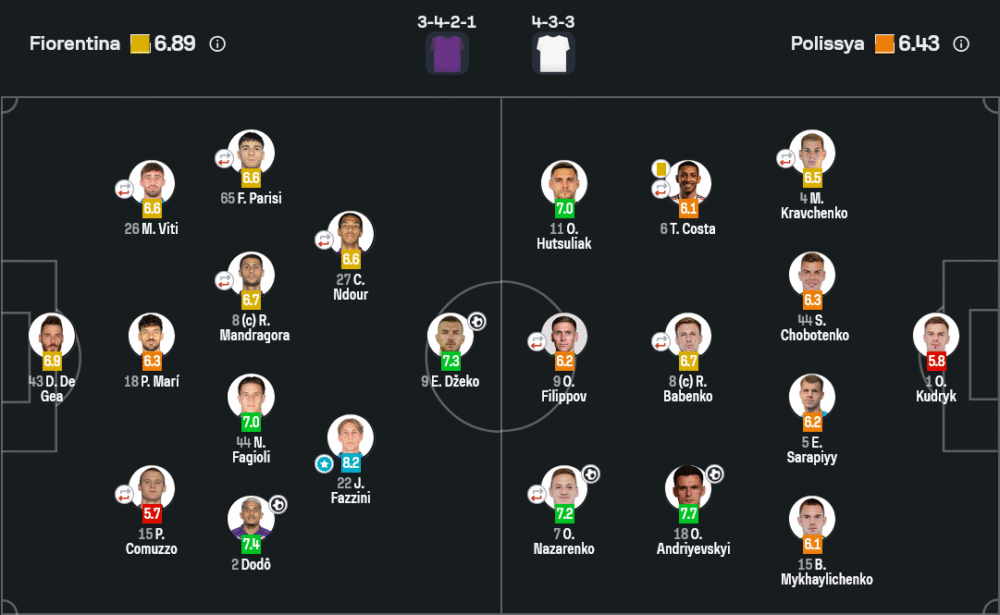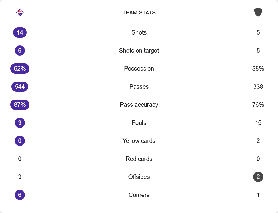 ฟิออเรนติน่า ครองบอลเหนือกว่า 62% สร้างโอกาสยิง 14 ครั้ง เข้ากรอบ 6 ส่วน โปลิสเซียมีเพียง 5 ครั้งแต่เข้ากรอบครบทั้ง 5 จุดแข็งคือความคมต้นเกม แต่ความผิดพลาดคือเสียบอลกลางสนามบ่อยครั้งจนโดนลงโทษ ทีมเจ้าบ้านต่อบอลมากถึง 544 ครั้ง ขณะที่ทีมเยือนทำได้เพียง 338 ครั้ง อัตราความแม่นยำก็ชัดเจนว่าฟิออเรนติน่าคือทีมที่เหนือกว่า