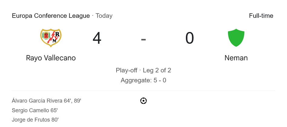 ชัยชนะนี้ทำให้ ราโย่ บาเยกาโน่ ผ่านเข้าสู่รอบแบ่งกลุ่ม ยูฟ่า คอนเฟอเรนซ์ลีก ได้อย่างสมศักดิ์ศรี พร้อมเพิ่มความมั่นใจต่อเนื่องในเส้นทางลาลีกาที่กำลังเข้มข้น ด้าน เนเมน กร็อดโน่ ตกรอบด้วยสกอร์รวม 0-5 กลับไปโฟกัสการเอาตัวรอดในลีก Vysshaya Liga ที่ต้องสู้ต่อ