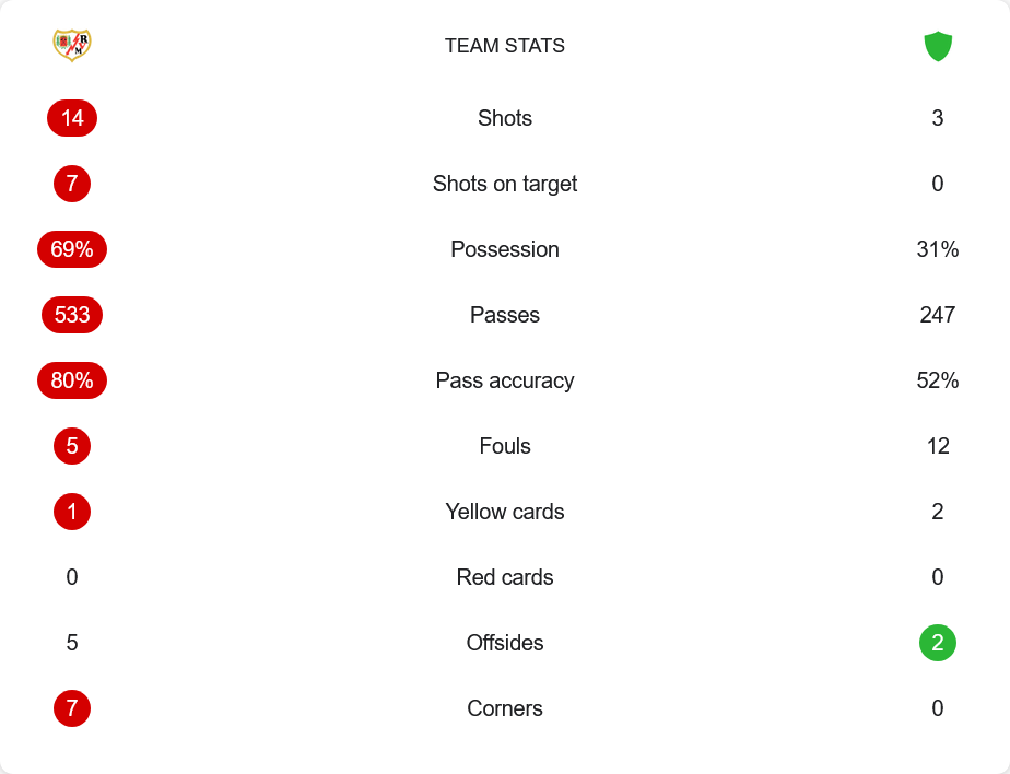 ราโย่ บาเยกาโน่ ครองเกมเหนือกว่าอย่างชัดเจน ครองบอล 69% สร้างโอกาสยิงได้ถึง 14 ครั้ง เข้ากรอบ 7 ครั้ง และเปลี่ยนเป็น 4 ประตู ขณะที่ เนเมน กร็อดโน่ มีโอกาสเพียง 3 ครั้ง และไม่มีลูกยิงเข้ากรอบเลย เกมรับของทีมเยือนพังทลายทั้งในจังหวะประกบและการยืนโซน การจ่ายบอลเจ้าบ้านมีความแม่นยำถึง 80% เทียบกับทีมเยือนที่ทำได้เพียง 52% ความแตกต่างของคุณภาพทีมสะท้อนออกมาในทุกตัวเลขสถิติ