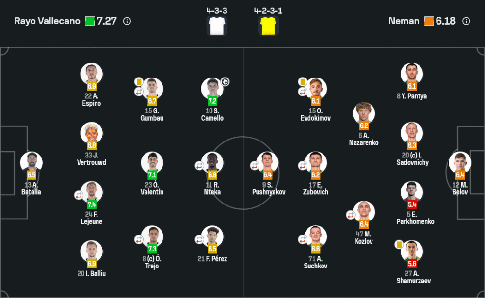 ราโย่ บาเยกาโน่ แสดงให้เห็นถึงความหลากหลายทางแท็กติก เกมรุกมาในระบบ 4-3-3 ใช้การเจาะริมเส้นและการจบสกอร์จากแดนสอง การ์เซีย และ เด ฟรูโตส คือสองตัวแสบที่สร้างฝันร้ายให้แนวรับเนเมน การซ้อนตำแหน่งและการเข้าทำรวดเร็วคืออาวุธหลัก ขณะที่เกมรับคุมโซนอย่างเหนียวแน่น แทบไม่เปิดโอกาสให้ทีมเยือนยิงเข้ากรอบเลยแม้แต่ครั้งเดียว ในทางกลับกัน เนเมน กร็อดโน่ เล่นเกมรับแบบตั้งรับลึก ใช้การแพ็คกลางห้าคนเพื่อหยุดความเร็วของเจ้าบ้าน แต่เมื่อถูกเจาะช่องทางริมเส้นก็แทบเอาไม่อยู่ นี่คือบทเรียนใหญ่ที่บ่งบอกถึงคุณภาพและมาตรฐานที่ต่างกันชัดเจนในการ วิเคราะห์บอล เกมนี้