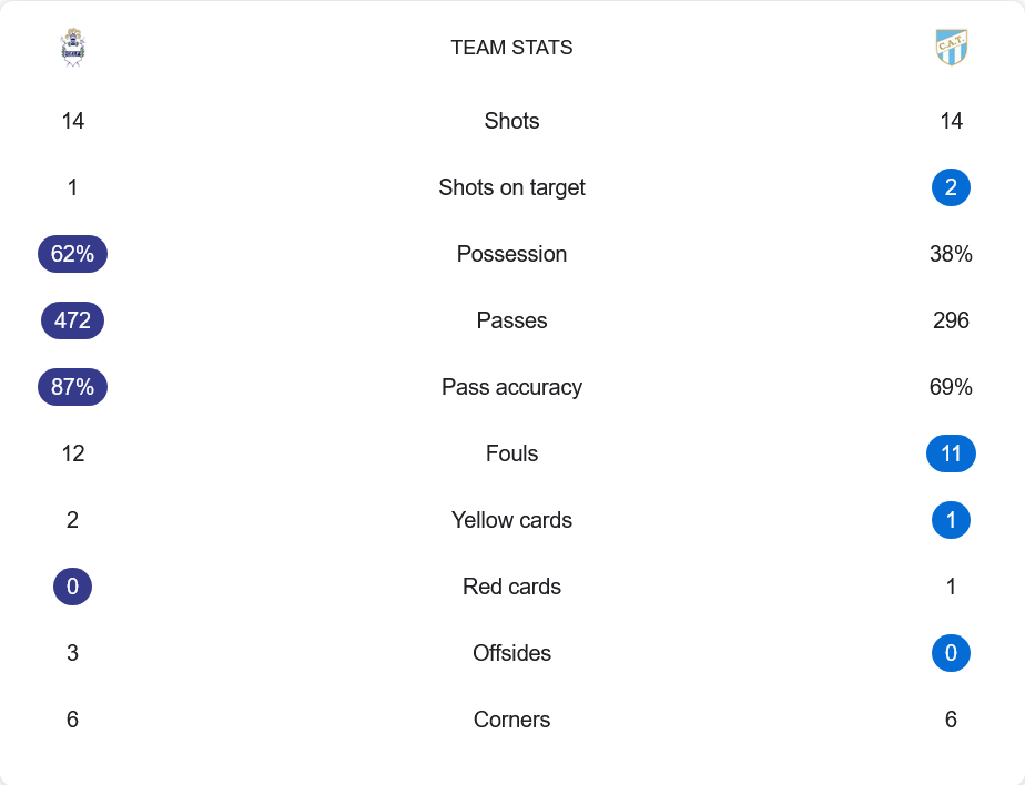 ตัวเลขยืนยันว่าเจ้าบ้านเหนือกว่า กิมนาเซียครองบอลมากถึง 62% ผ่านบอล 472 ครั้ง ความแม่นยำสูงถึง 87% เทียบกับทูคูแมนที่ครองบอล 38% ผ่านบอลเพียง 296 ครั้ง ความแม่นยำแค่ 69% จังหวะเข้าทำทั้งคู่ยิง 14 ครั้งเท่ากัน แต่เจ้าถิ่นยิงเข้ากรอบแค่ 1 ส่วนทีมเยือน 2 ครั้ง ฟาวล์ใกล้เคียงกัน กิมนาเซีย 12 ครั้ง ทูคูแมน 11 ครั้ง แต่ทีมเยือนโดนใบแดงทำให้รูปเกมเปลี่ยนไป