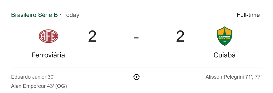จาก : ผลบอลสด คัมปิโอนาโต บราซิเลียโร ซีรีบี ระหว่าง เฟอร์โรเวียเรีย เอสพี 2-2 คุยอาบา วันนี้ 2/9/68 – บ้านกีฬา