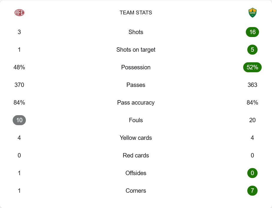 แม้สกอร์ออกมาเสมอ แต่ตัวเลขชัดเจนว่าคุยอาบาคือฝ่ายบุกแหลก ครองบอล 52% เทียบกับ 48% ของเจ้าถิ่น สร้างโอกาสยิงถึง 16 ครั้ง เข้ากรอบ 5 ครั้ง ขณะที่เฟอร์โรเวียเรียมีเพียง 3 ครั้ง เข้ากรอบแค่ 1 เกมนี้ทั้งสองทีมฟาวล์หนักรวม 30 ครั้ง แจกใบเหลืองทีมละ 4 แสดงถึงความเข้มข้นและดุดันตลอด 90 นาที