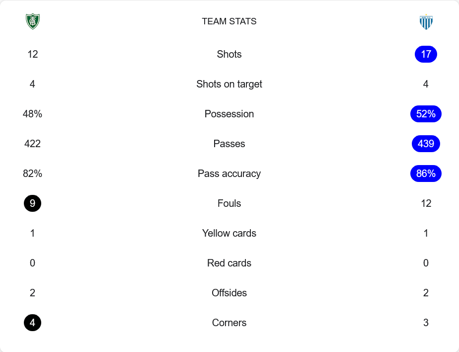 เกมนี้อเมริกา เอ็มจี ยิง 12 ครั้ง เข้ากรอบ 4 ส่วนอาไวบุกมากกว่า ยิง 17 ครั้ง แต่เข้ากรอบเพียง 4 เท่ากัน ครองบอลใกล้เคียง อเมริกา 48% อาไว 52% การจ่ายบอลอเมริกา 422 ครั้ง แม่นยำ 82% ส่วนอาไว 439 ครั้ง แม่นยำถึง 86% ทว่าความแตกต่างคือประสิทธิภาพในแดนสุดท้าย ฟาวล์อเมริกา 9 อาไว 12 ใบเหลืองทีมละหนึ่ง