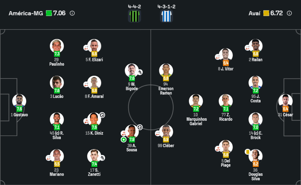 กองกลาง: 8 วีตอร์ (6.4), 95 คอสต้า (7.2), 94 รามอน (6.8), 10 มาร์กินญอส กาเบรียล (7.2)