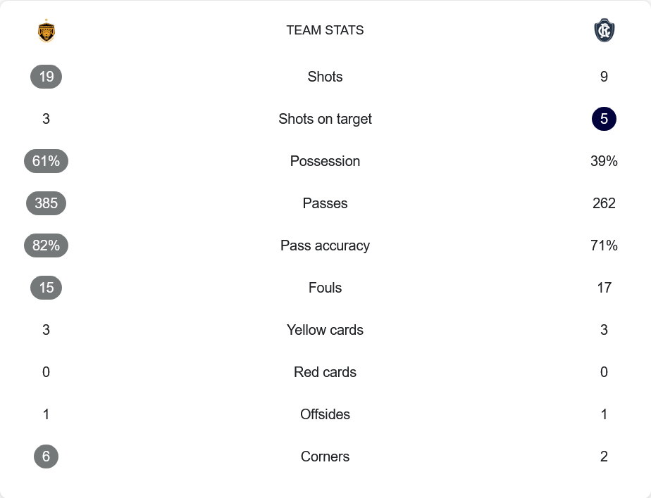 แม้อมาโซนาสจะครองบอลมากถึง 61% และมีโอกาสยิง 19 ครั้ง แต่ตรงกรอบเพียง 3 ครั้งเท่านั้น ส่วนเรโม่ยิงน้อยกว่าแค่ 9 ครั้ง แต่ตรงกรอบถึง 5 ครั้งเต็มๆ แถมความแม่นยำในการจ่ายบอลของอมาโซนาสสูงถึง 82% แต่เมื่อเจอการเพรสซิ่งของเรโม่ที่เหนียวแน่น ทำให้เกมรับพังทลายหลายครั้ง ขณะที่จำนวนฟาวล์ใกล้เคียงกัน 15 ต่อ 17 ใบเหลืองออกฝั่งละ 3 ใบ ถือเป็นเกมที่เข้มข้นดุเดือดตลอด 90 นาที
