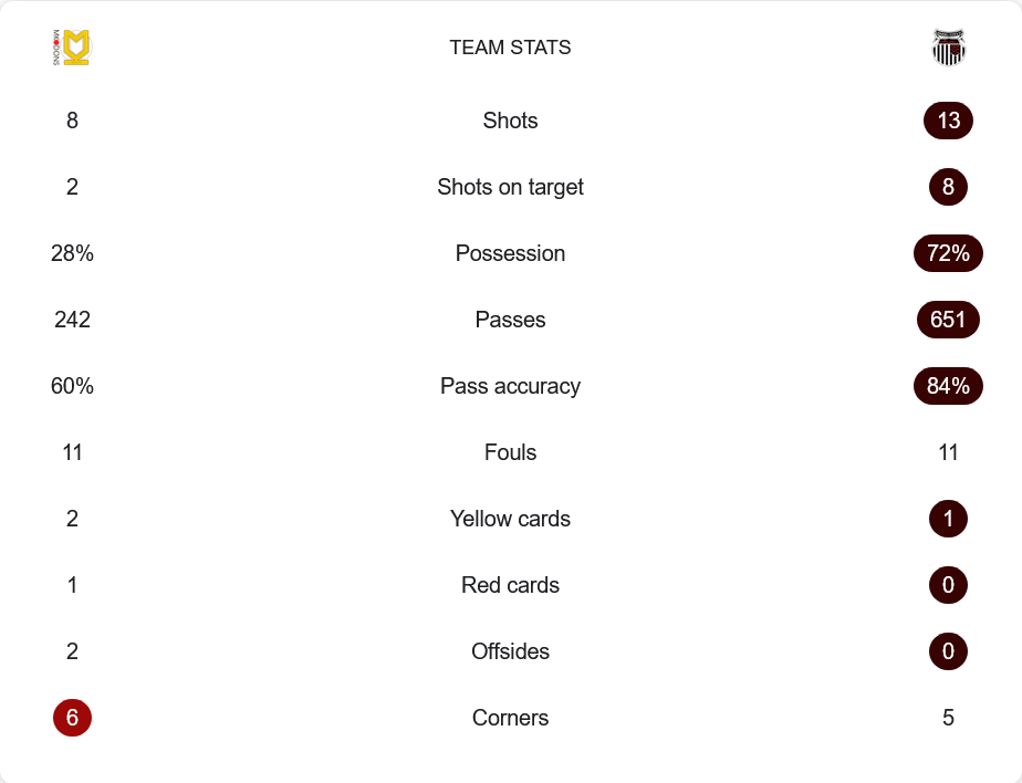 เกมนี้กริมสบี้ครองบอลมากถึง 72% เทียบกับเจ้าบ้านเพียง 28% ส่งบอล 651 ต่อ 242 ครั้ง แถมความแม่นยำการจ่ายเหนือกว่า 84% ต่อ 60% การสร้างสรรค์โอกาสก็เด่นชัด ทีมเยือนยิง 13 ครั้ง เข้ากรอบ 8 ขณะที่เอ็มเค ดอนส์มีแค่ 8 ครั้ง เข้ากรอบเพียง 2 แม้ดอนส์จะได้เตะมุมมากกว่า 6 ต่อ 5 แต่ก็ไม่สามารถเปลี่ยนเป็นประตูสำคัญได้ เกมนี้มีฟาวล์เท่ากัน 11 ต่อ 11 ใบเหลืองฝั่งกริมสบี้ 1 ใบ ส่วนเจ้าบ้านโดนทั้ง 2 ใบเหลืองและ 1 ใบแดง
