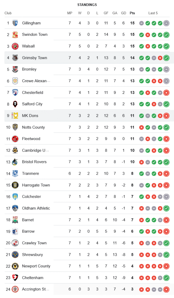 ชัยชนะนี้พากริมสบี้ ทาวน์ ขยับขึ้นอันดับ 4 ของตารางลีกทู มี 14 คะแนนจาก 7 นัด ไล่บี้กลุ่มหัวตารางเพียงแต้มเดียว ขณะที่เอ็มเค ดอนส์หล่นไปอยู่อันดับ 9 มี 11 คะแนน ทำให้เกมต่อไปของทั้งสองทีมสำคัญอย่างยิ่งในการชี้วัดเส้นทางซีซั่นนี้
