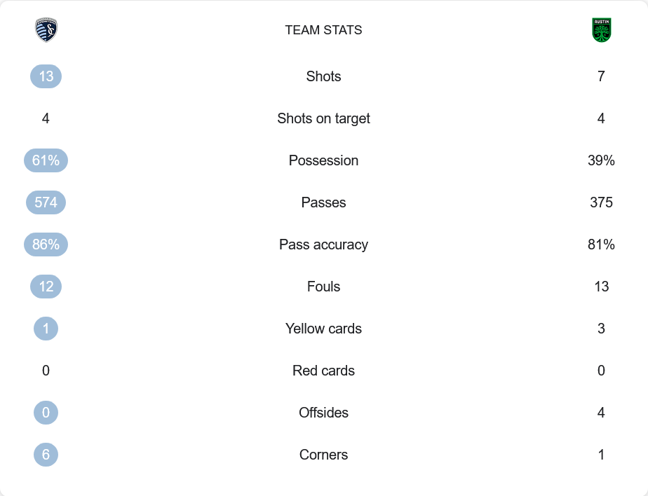 แม้แคนซัสจะครองบอลมากกว่า 61% และผ่านบอลได้ถึง 574 ครั้ง เทียบกับออสตินที่มีเพียง 375 ครั้ง แต่ทั้งคู่ยิงตรงกรอบเท่ากันที่ 4 ครั้ง ฝั่งเจ้าบ้านได้เตะมุม 6 ครั้ง ขณะที่ทีมเยือนเพียง 1 ครั้ง ตัวเลขชี้ชัดว่าแคนซัสมีโอกาสมากกว่า แต่ความคมของออสตินคือความแตกต่าง