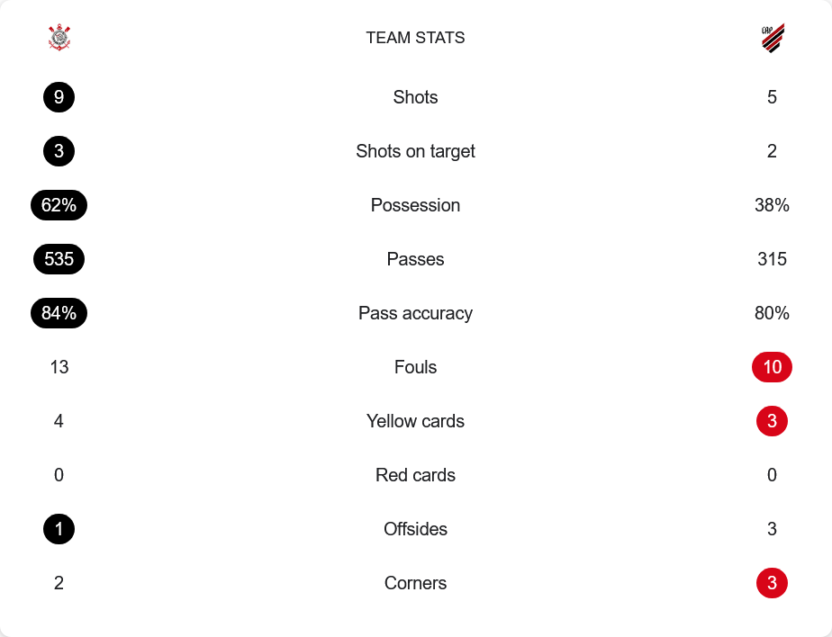 โครินเธี่ยนส์ยิงทั้งหมด 9 ครั้ง เข้ากรอบ 3 ครองบอล 62% ผ่านบอล 535 ครั้ง ความแม่นยำ 84% ส่วนพารานาเอนเซ่มีโอกาสยิงเพียง 5 ครั้ง เข้ากรอบ 2 ครองบอลแค่ 38% ผ่านบอล 315 ครั้ง แม่นยำ 80% ตัวเลขสะท้อนภาพเกมชัดว่าเจ้าบ้านคุมทุกจังหวะเหนือกว่า