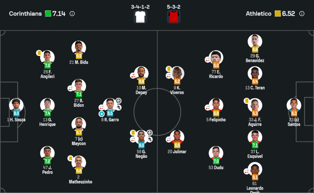 โครินเธี่ยนส์: โรดริโก้ การ์โร 8.5 (ยิง+สร้างสรรค์), กุสตาโว่ เนเกา 8.0 (แอสซิสต์+คุมเกมรุก), ฮูโก้ ซูซ่า 8.0 (เซฟมั่นใจ)