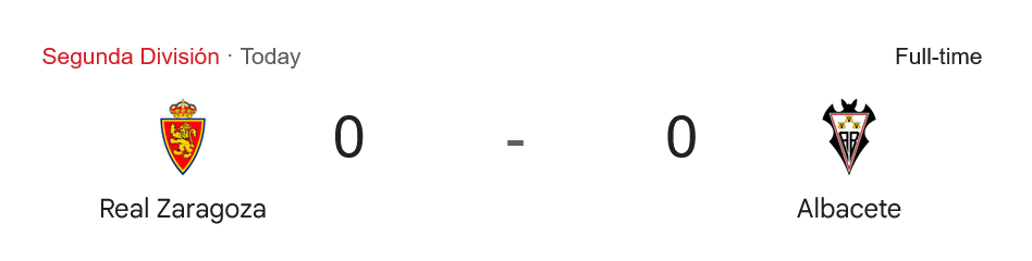 บ้านกีฬา พามาเกาะติด ผลบอลสด ศึก ลา ลีกา 2 (เซกุนด้า ดิวิชั่น) คู่ระหว่าง เรอัล ซาราโกซ่า เปิดรังต้อนรับการมาเยือนของ อัลบาเซเต้ จบเกมด้วยผลเสมอ 0-0 ในแมตช์ที่เต็มไปด้วยความเข้มข้นแต่ไร้ความเฉียบคม ทำให้ทั้งสองทีมยังคงจมโซนท้ายตารางแบบน่าเป็นห่วง