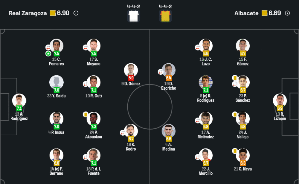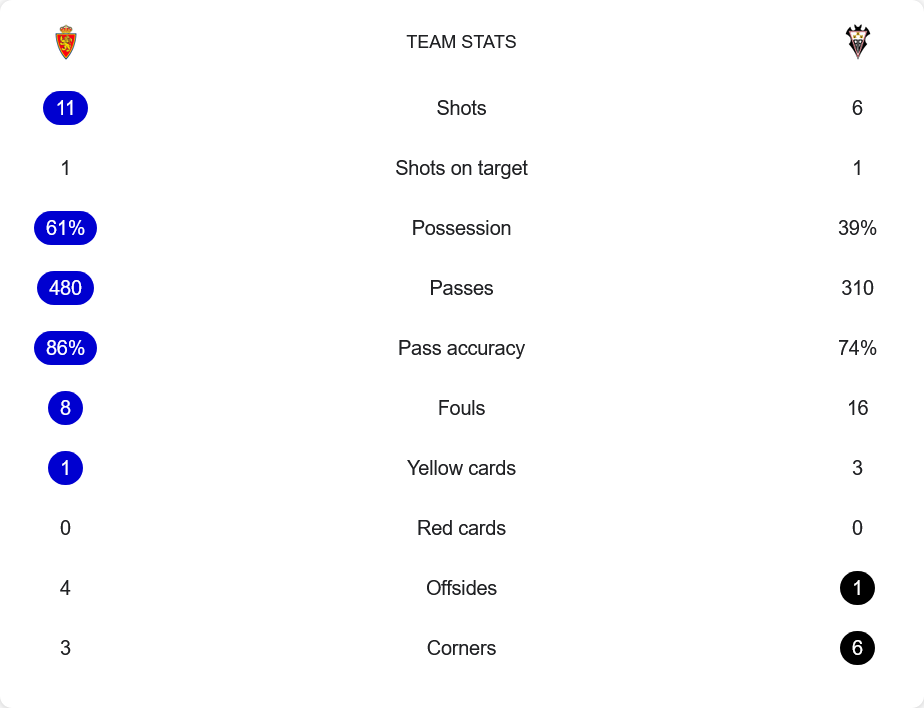 ซาราโกซ่ามีโอกาสยิงทั้งหมด 11 ครั้ง แต่ตรงกรอบเพียง 1 ครั้ง ครองบอลมากถึง 61% และจ่ายบอลแม่นยำกว่า 86% ส่วนอัลบาเซเต้ยิง 6 ครั้ง ตรงกรอบ 1 ครั้ง ครองบอล 39% จ่ายบอลสำเร็จ 74% ฟาวล์รวมสูงถึง 24 ครั้งในเกมนี้ โดยทีมเยือนได้ใบเหลืองถึง 3 ใบ ขณะที่เจ้าบ้านได้ 1 ใบ