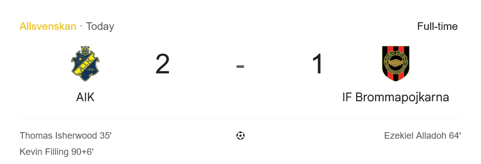บ้านกีฬา พามาสรุป ผลบอลสด ศึก ออลสเวนส์คาน สวีเดน เกมสุดมันส์ที่สนามโซลน่า เจ้าถิ่น เอไอเค เปิดรังเฉือนชนะ บรอมมาปอจคาร์น่า ไปได้ 2-1 จากประตูชัยในช่วงทดเจ็บนาที 90+6 โดย เควิน ฟิลลิ่ง กลายเป็นฮีโร่พาทีมคว้าสามคะแนนสำคัญได้แบบสุดดราม่า