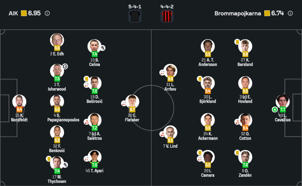 เกมนี้เอไอเคเหนือกว่าชัดเจน ยิงทั้งหมด 15 ครั้ง เข้ากรอบ 8 ครั้ง ครองบอล 51% และจ่ายบอลแม่นถึง 83% ขณะที่บรอมมาปอจคาร์น่ายิงเพียง 3 ครั้ง เข้ากรอบเพียง 1 ครั้ง ครองบอลใกล้เคียงกันที่ 49% แต่มีใบเหลืองถึง 4 ใบ แสดงให้เห็นถึงความกดดันและความผิดพลาดในการป้องกัน
