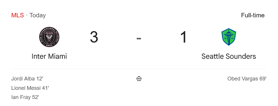 กลับมาครึ่งหลัง นาที 52 ไมอามีตอกย้ำความเหนือชั้นเมื่อ เอียน เฟรย์ เติมขึ้นมายิงเสียบมุมอย่างเฉียบขาด สกอร์ไหลเป็น 3-0 แม้ซีแอตเทิลจะพยายามเปิดเกมแลกจนได้ประตูตีไข่แตกในนาที 69 จาก โอบิด วาร์กัส แต่สุดท้ายก็ไล่ไม่ทัน จบเกม อินเตอร์ ไมอามีเก็บชัยสุดสำคัญ 3-1 พร้อมส่งเสียงเชียร์ลั่นใน บ้านผลบอล คืนนี้