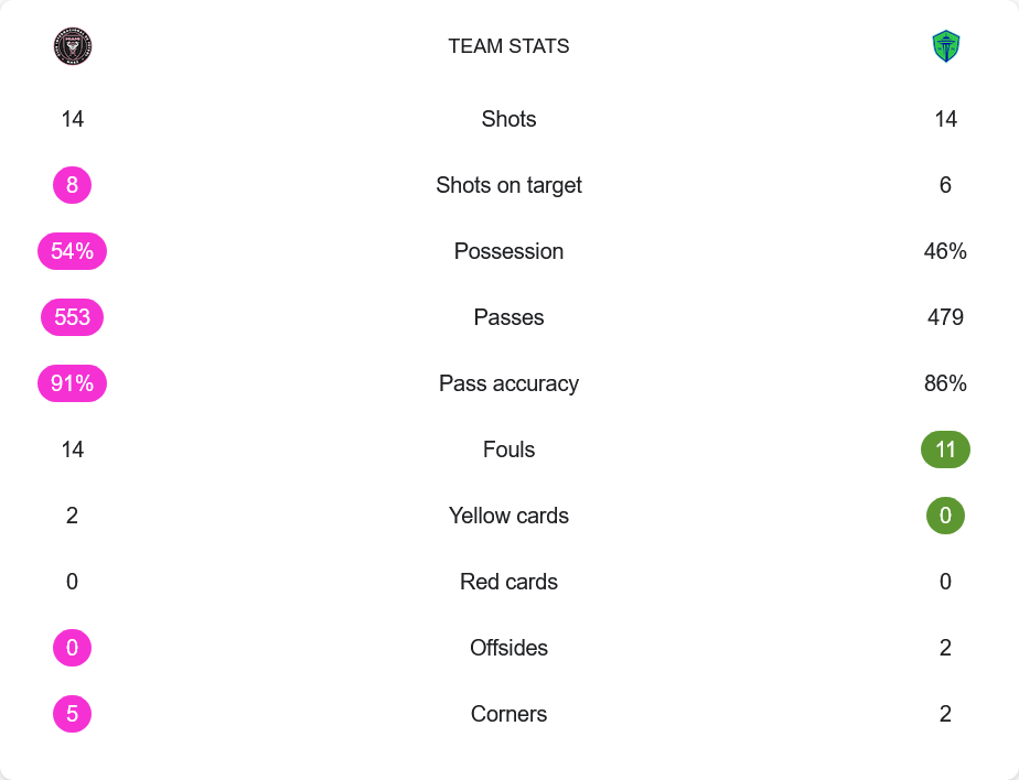 แม้ทั้งสองทีมจะมีจำนวนการยิงเท่ากันที่ 14 ครั้ง แต่ไมอามีเหนือกว่าด้วยการยิงตรงกรอบ 8 ครั้ง เทียบกับซีแอตเทิลที่มี 6 ครั้ง ไมอามีครองบอล 54% จ่ายบอลมากถึง 553 ครั้งด้วยความแม่นยำสูงถึง 91% แสดงถึงการครองเกมและคอนโทรลได้ดีกว่า ซีแอตเทิลแม้จะพยายามไล่บี้แต่ก็มีเพียง 479 ครั้งและความแม่นยำ 86% ตัวเลขฟาวล์เกือบสูสี แต่ไมอามีเสียใบเหลืองไป 2 ใบ ขณะที่ซีแอตเทิลไม่มีเลย