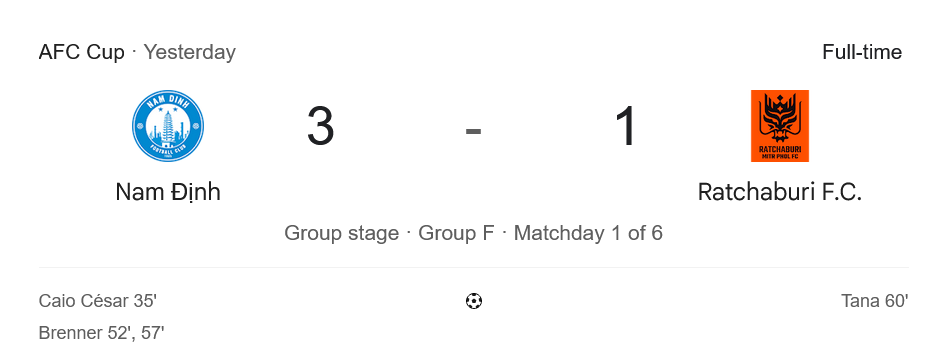 บ้านกีฬา รายงานผลแบบ ผลบอลสด โคตรเดือดที่สนามในเวียดนาม เมื่อ นัม ดินห์ เอฟซี เปิดบ้านไล่บด ราชบุรี เอฟซี 3–1 เกมที่มีทั้งพลัง วิ่งไล่กดดัน และคมต่อคม คนทำแสบคือ เบรนเนอร์ ดาวยิงบราซิลที่กดสองเม็ด บวกกับลูกปลดล็อกของ ไคโอ เซซาร์ ส่วนฝั่งราชบุรีมี ดานีโล่ จูเนียร์ ยิงปลอบใจ ชัยชนะนัดนี้ทำให้นัม ดินห์เก็บ 3 แต้มแรก ขยับเป็นอันดับ 2 ของกลุ่ม F เอเอฟซี แชมเปี้ยนส์ลีก อีลิท ทู เทียบแต้มจ่าฝูงและโยนความกดดันกลับมาที่เสือแกว่งจากแดนสยามทันที